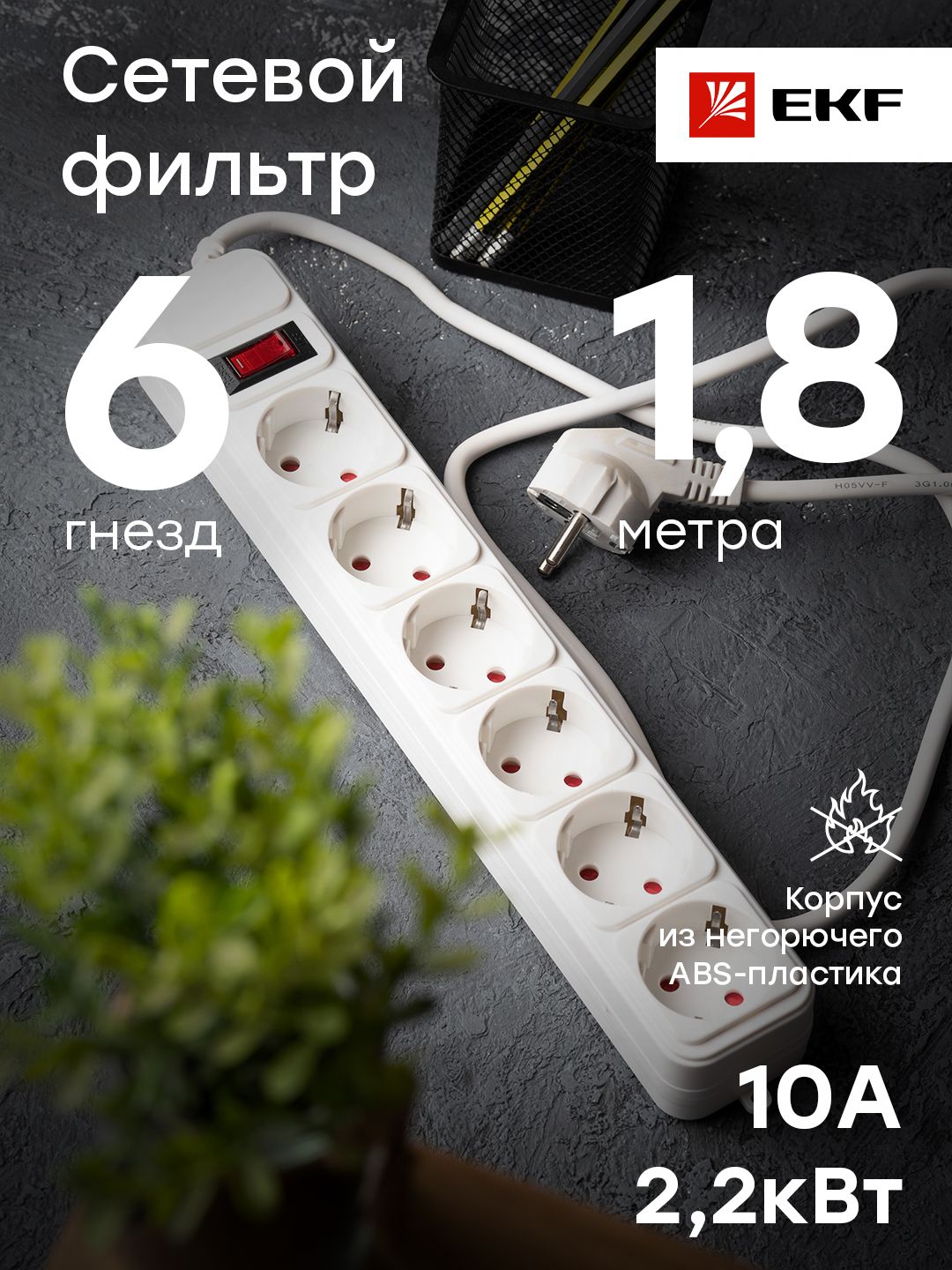 Сетевой фильтр 6*1,8м 10А/2,2кВт с выкл. c/з ПВС 3х0,75 Блокбастер EKF PROxima - ваш надежный помощник для обеспечения электро- и пожаробезопасности вашего рабочего места или дома.