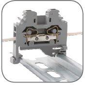 Особое преимущество данных клемм – в безвинтовом креплении проводников: используются подпружиненные самозажимные контакты. Подвод проводника осуществляется сбоку клеммы. Для отсоединения проводника необходимонажать отверткой на пружину через отверстие, расположенное сверху клеммы. Рассчитаны на применение в цепях переменного тока с напряжением до 800 В и частотой 50 Гц. Клеммы изготавливаются из огнестойкого полиамида следующих цветов: серый, синий, желто-зеленый (земля). Дополнительно к клеммам выпускаются боковые заглушки для закрытия контактов конечной клеммы, перемычки для разветвления проводников и др.